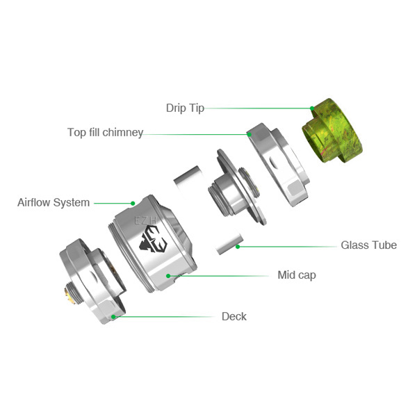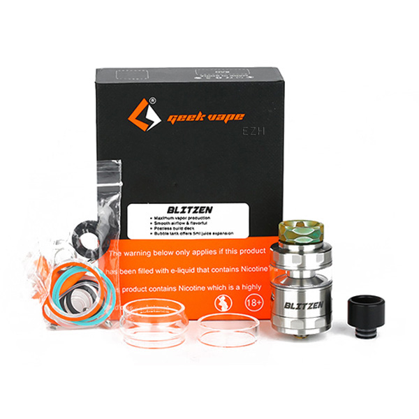 Der Geekvape Blitzen RTA bietet eine optimale Geschmacksentfaltung und dichte Dampfentwicklung. Er verfügt über ein Postless Deck auf welchem auch größere Single oder Dual Wicklungen untergebracht werden können und ist dennoch nahe zu Auslauf sicher. Er hat 2 ml Tankvolumen, kann aber mit dem mit geliefertem Bubbleglas auf 5ml erhöht werden.