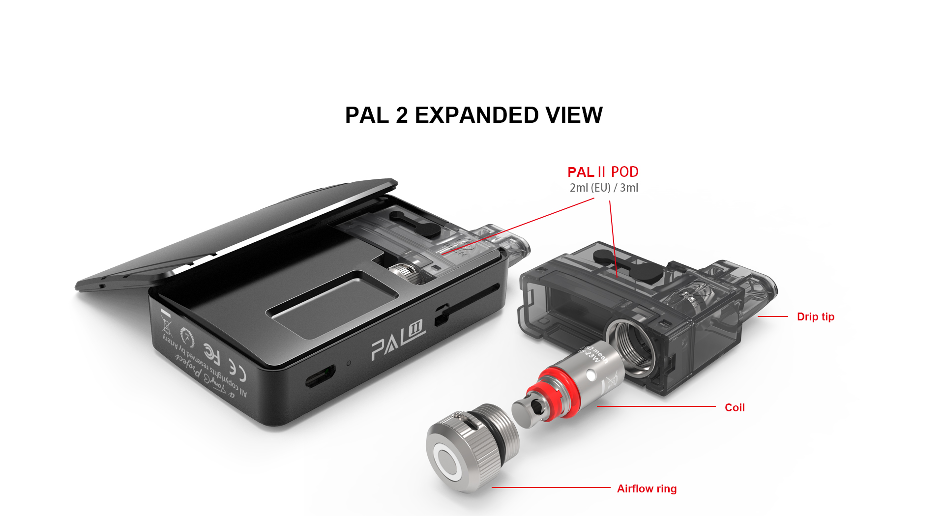 Mit einer Batterieleistung von 1000 mAh biete das PAL 2 genügend Energie für den Tag und kann bei Bedarf über das Micro-USB Kabel aufgeladen werden. Leichtes Nachfüllen des PODs und das Einstellen des Airflows sind noch weitere Highlight des PAL 2.
