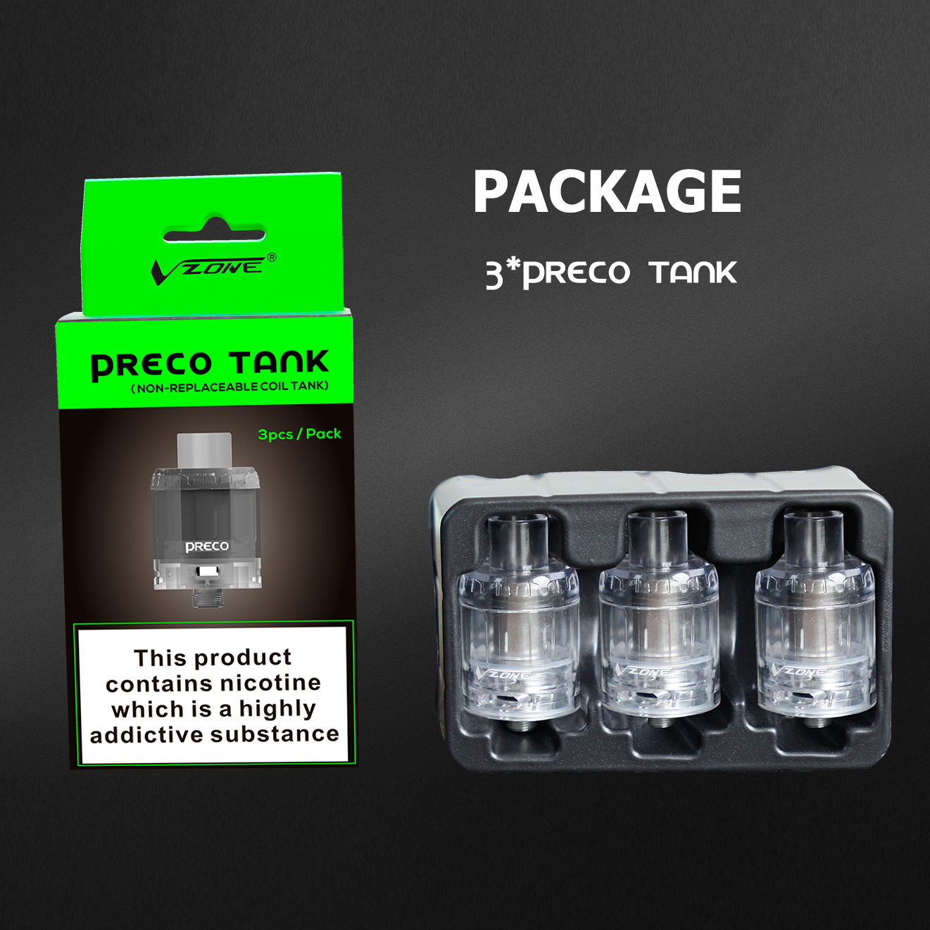 3er-Pack VZone Preco Tanks transparent. Die Coils sind nicht wechselbar.