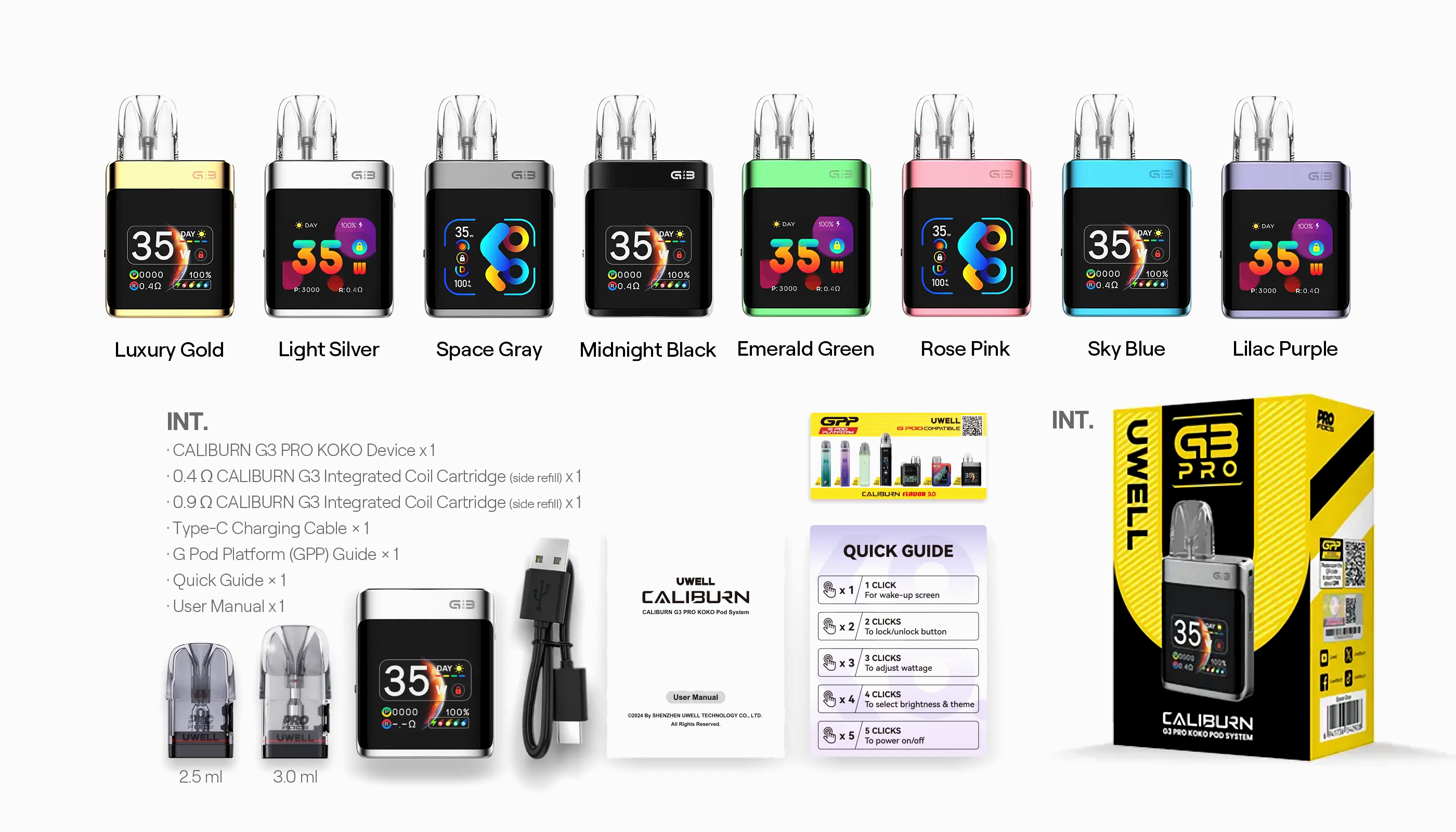 Ein Meilenstein in Uwells Entwicklung war die Einführung der Caliburn-Serie im Jahr 2019. Mit diesen kompakten und anwenderfreundlichen Pod-Systemen hat Uwell den Einstieg in die Welt des Dampfens revolutioniert. Die Geräte sind perfekt auf die Bedürfnisse von Einsteigern und Gelegenheitsdampfern abgestimmt: einfache Handhabung, minimaler Wartungsaufwand und eine intuitive Bedienung – ganz ohne komplizierte Menüs oder zahlreiche Einstellungsoptionen. Dank integrierter Zugautomatik und durchdachter Features bietet die Caliburn-Serie eine nachhaltige Alternative zu Einweg-E-Zigaretten, die auf Langlebigkeit und Komfort setzt.